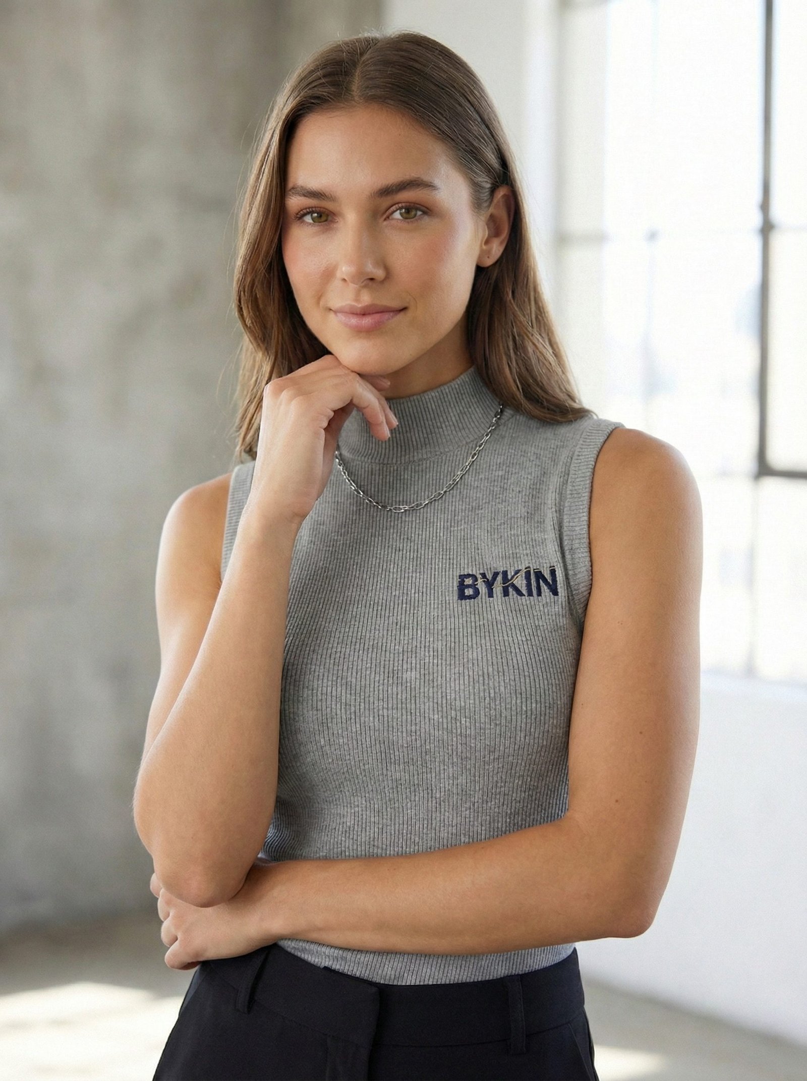 Elevate your daily rotation with the BYKIN Vintage Mock-Neck Sleeveless Knit Vest. This piece is engineered for the fast-paced urban woman who demands a seamless transition from a professional morning commute to a relaxed weekend brunch. Featuring a sophisticated mock-neck silhouette and our signature embroidered logo, it offers a tailored look that feels as good as it looks.